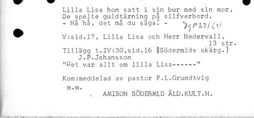 //// Lilla Lisa hon satt i sin bur med sin mor, //// De spelte guldtärning på silfverbord. //// - Hå hå, det må du sägaf - //// ^ V:sid.l7, Lilla Lisa och Herr Nedervall, //// 13 str. //// Tillägg t.IV:30,sid.l6 ^Södermlds skärg.) //// J.P.Johansson //// "Det var allt om lilla Lisa------" //// Kom:meddelad av pastor F.L.Grundtvig //// m. m. //// , AMISON SÖDERMLD ÄLD.KULT.H. ////