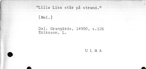 //// ) "Lilla Lisa står på strand." //// [ (Mel.) //// ^ Dal. Grangärde, 14900, s.126 //// Eriksson, L. //// ULMA ////
