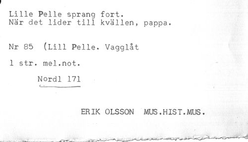 //// Lille Pelle sprang fort. //// När det lider till kvällen, pappa. //// Nr 85 (Lill Pelle. Vagglåt //// 1 str. mel.not. //// Nordl 171 //// f - - - - „ //// ERIK OLSSON MUS.HIST.MUS. //// ' . t* .. ////