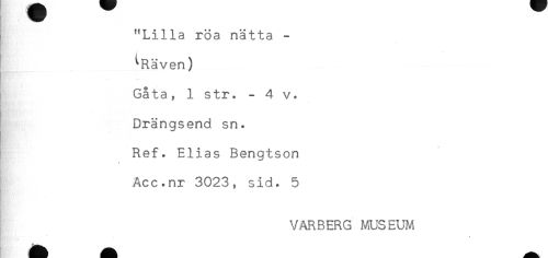 //// "Lilla roa nätta - //// ^Räven) //// Gåta, 1 str. - 4 v. //// Drängsend sn. //// Ref. Elias Bengtson //// * //// . //// Acc.nr 3023, sid. 5 //// VARBERG MUSEUM ////