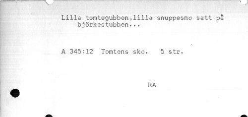 //// Lilla tomtegubben,lilla snuppesno satt på //// björkestubben... //// A 345:12 Tomtens sko. 5 str. //// ' ' ' //// . //// RA //// B-' -M : ////