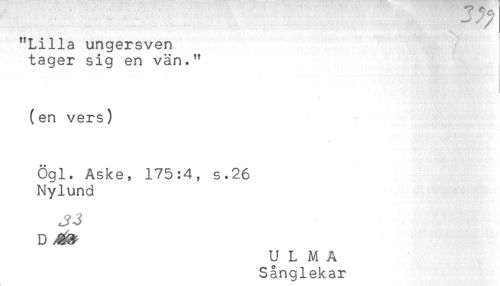 //// "Lilla ungersven //// tager sig en vän." //// (en vers) //// Ögl. Aske, 175:4, s.26 //// Nylund //// D //// U L M A //// Sånglekar ////