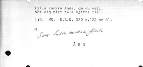 //// ! Lilla vackra Anna, om du vill, //// f hör dig mitt hela hjärta till. //// i 1:5, MS. S.L.S. 330 s.122 nr 81. //// A //// A B O ////