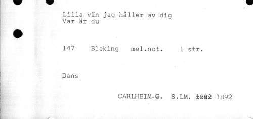 //// Lilla vän jag håller av dig //// Var är du //// * //// 147 Bleking mel.not. 1 str. //// I //// - //// ! Dans //// CARLHEIM-6. S.LM. i882 1892 //// Bwi*' * ////