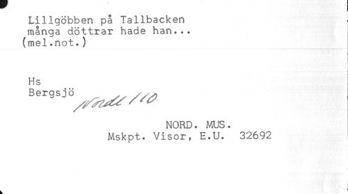 //// Lillgöbben på Tallbacken . //// många döttrar hade han... //// (mel.not.) //// < //// < //// Hs //// NORD. MUS. //// Mskpt. Visor, E.U. 32692 //// ' ////