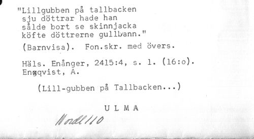 //// "Lillgubben pa tallbacken //// sju döttrar hade han //// sålde bort se skinnjacka //// köfte döttrerne gullbann." //// (Barnvisa). Fon.skr. med övers. //// Hals. Enånger, 2415:4, s. 1. (l6:o). //// Engqvist, A. //// (Lill-gubben på Tallbacken...) //// U L M A ////