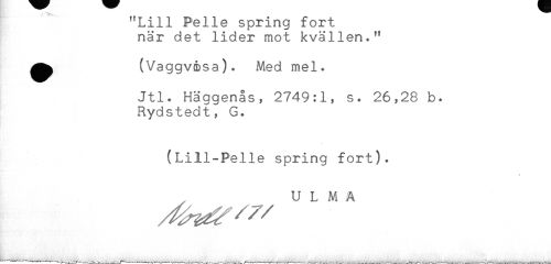 //// "Lill Pelle spring fort //// när det lider mot kvällen." //// ^^ (Vaggvmsa). Med mel. //// Jtl. Häggenås, 2749:1, s. 26,28 b. //// Rydstedt, G. //// (Lill-Pelle spring fort). //// U L M A //// -----____r*-------- ////