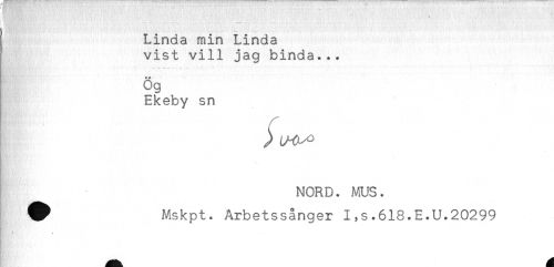 //// . . , //// Linda min Linda //// vist vill jag binda... //// ög //// Ekeby sn //// ) //// NORD. MUS. //// V Mskpt. Arbetssånger I,s.618.E.U.20299 ////