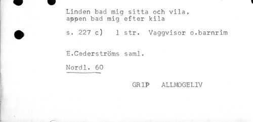 //// Linden bad mig sitta och vila, //// appen bad mig efter kila //// ^^ s. 227 c) 1 str. Vaggvisor o.barnrim //// E.Cederströms saml. //// Nordl. 60 //// t; " //// GRIP ALLMOGELIV ////