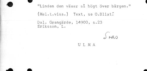 //// "Linden den växer så högt över bärgen." //// (Mel.t.visa.) Text, se O.Blixtf //// [ . Dal. Grangärde, 14900, s.23 //// Eriksson, L. //// U L M A ////