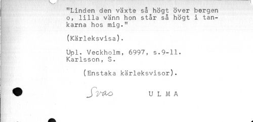 //// "Linden den växte så högt över bergen //// o, lilla vänn hon står så högt i tan- //// karna hos mig." //// (Kärleksvisa). //// Upl* Veckholm, 6997, s.9-11. //// Karlsson, S. //// (Enstaka kärleksvisor). //// ^ J U L M A ////