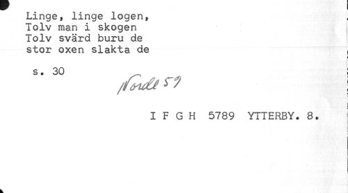 //// Linge, linge logen, //// Tolv man i skogen //// Tolv svärd buru de //// stor oxen slakta de = //// t //// s. 30 _ i //// ! //// j //// I F G H 5789 YTTERBY. 8. //// : //// - !.* ! //// t //// C ////