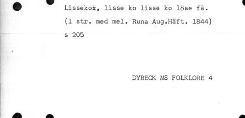 //// W Lissekox, lisse ko lisse ko lose ia. //// (1 str. med mel. Runa Aug.Häft. 1844) //// s //// s 205 //// * //// DYBECK MS FOLKLORE 4 ////