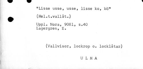//// "Lisse usse, usse, lisse ko, bö" //// ^ (Mel.t.vallat.) //// Uppl. Nora, 9081, s.40 //// Lagergren, E. //// < //// (Vallvisor, lockrop o. locklåtar) //// U L M A ////