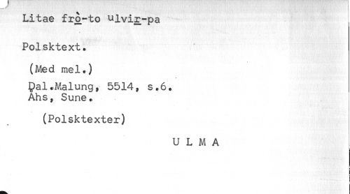 //// Litae fro.-to ulvir-pa //// * t. ,*' * //// Polsktext. //// (Med mel.) //// pal.Malung, 5514, s.6. //// Ahs, Sune. //// (Polsktexter) //// U L M A ////