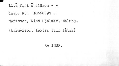 //// Lita frat o slörpa - - //// insp. Rtj. 10660:92 d //// Mattsson, Niss Hjalmar, Malung. //// (barnvisor, texter till låtar) //// RA INSP. ////
