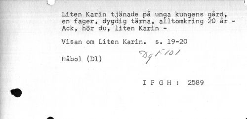 //// Liten Karin tjänade på unga kungens gård, //// en fager, dygdig tärna, alltomkring 20 år - //// Ack, hör du, liten Karin - //// Visan om Liten Karin. s. 19-20 //// / //// /Håbol (Dl) //// * //// - , .' * ' . - //// ^ - //// I F G H : 2589 //// K ' ////