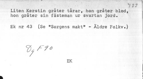 //// - - - Y7J //// Liten Kerstin gråter tårar, hon gråter blod, //// hon gråter sin fästeman ur svartan jord. //// Ek nr 43 (Se "Sorgens makt" - Äldre Folkv.) //// * //// EK //// ; //// t ////