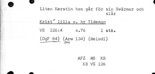 //// Liten Kerstin hon går för sin Svärmor och //// slår //// Krist" lilla o. hr Tideman //// VS 126:4 s.76 1 stt. //// (DgF 84) (Arw 134) (Melodi) //// AFZ MS KB //// KB VS 126 ////
