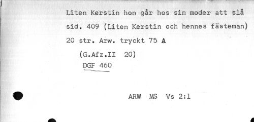 //// Liten Kerstin hon går hos sin moder att slå //// sid. 409 (Liten Kerstin och hennes fästeman) //// 20 str. Arw. tryckt 75 Å //// (G.Afz.II 20) //// DGF 460 //// ^ ARW MS Vs 2:1 ////