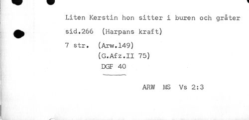 //// } //// Liten Kerstin hon sitter i buren och gråter //// ! //// ! //// sid.266 (Harpans kraft) //// 7 str. (Arw.149) //// (G.Afz.II 75) //// DGF 40 //// ARW MS Vs 2:3 //// < //// J ////