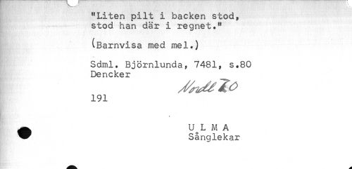 //// - //// "Liten pilt i backen stod, //// stod han där i regnet." //// (Barnvisa med mel.) //// * //// Sdml. Bjömlunda, 7481, s.80 //// Dencker //// 191 //// t //// ^ U^L M A //// ^^ Sånglekar ////