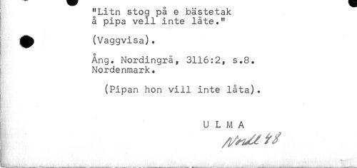 //// "Litn stog pa e bastetak //// å pipa vell inte late." //// ^ (Vaggvisa). //// o //// Ang. Nordingrå, 3116:2, s.8. //// Nordenmark. //// (Pipan hon vill inte låta). //// U L M A ////