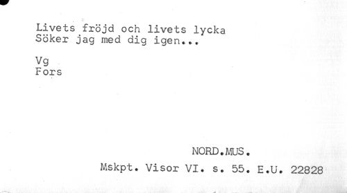 //// Livets fröjd och livets lycka //// Söker jag med dig igen... //// Vg //// Fors //// NORD. M. //// Mskpt. Visor VI. s. 55. E.U. 22828 ////