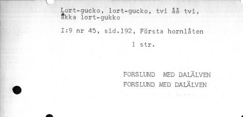 //// Lort-gucko, lort-gucko, tvi åå tvi, //// akka lort-gukko //// 1:9 nr 45, sid.192, Första hornlåten //// 1 str. //// - //// FORSLUND MED DALÄLVEN //// FORSLUND MED DALÄLVEN //// ** - ^ t *< * i ////