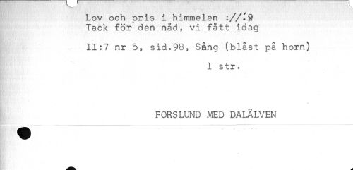 //// Lov och pris i himmelen //// Tack för den nåd, vi fått idag //// ^ ^ 11:7 nr 5, sid.98, Sång (blåst på horn) //// 1 str. //// FORSLUND MED DALÄLVEN ////
