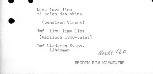 //// Lova lova lina //// må solen den skina //// (bendixon Visbok) //// Jmf Limu limu lima //// (Mariabön 1300-talet) //// Jmf Liedgren Sv.ps. //// Lindeman ^^ ^ //// BRODIN RIM KOMMENTAR ////