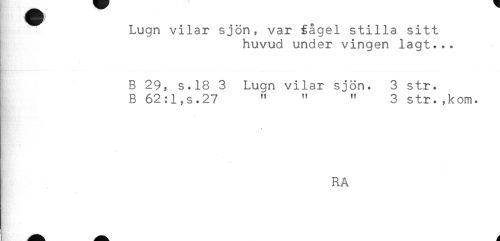 //// Lugn vilar sjön, var fågel stilla sitt //// huvud under vingen lagt... //// - //// L //// - //// B 29, s.18 3 Lugn vilar sjön. 3 str. //// B 62:1,s.27 " " " 3 str.,kom. //// RA ////