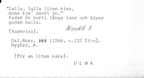 //// "Lulla, lulla liten kinn, //// mona kom' snart in." //// fader är borti långa land och köper //// godan bulle. //// (Barnvisa). //// Dal.Mora, 11266, s.122 (8:o).' //// Nygård, A. //// (För en liten kaka). //// U L M A ////