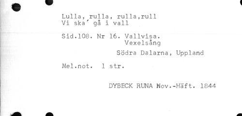//// Lulla, rulla, rulla,rull //// Vi ska' gå i vall //// Sid.108. Nr 16. Vallvisa. //// Vexelsång //// Södra Dalarna, Uppland //// Mel.not. 1 str. //// DYBECK RUNA Nov.-Häft. 1844 ////