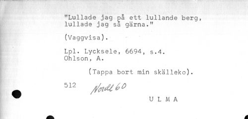 //// "Lullade jag på ett lullande berg, //// lullade jag så gärna." //// (Vaggvisa). //// Lpl. Lycksele, 6694, s.4. //// Ohlson, A. //// (Tappa bort min skälleko). //// * U L M A ////