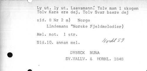 //// Ly ut, ly ut, Laavamannf Tolv man i skogen //// Tolv Kara ere dej, Tolv Svar baere dej //// § ^ sid. 8 Nr 2 m) Norge //// Lindemans "Norske Fjeldmelodier) //// Mel. not. 1 str. //// < //// Sid.10. annan mel. //// ^ DYBECK RUNA //// SV.VALLV. & HORNL. 1848 ////