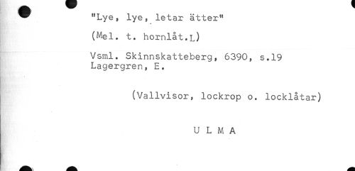 //// * "Lye, lye, letar ätter" //// * //// (Mel. t. hornlåt.L) //// Vsml. Skinnskatteberg, 6390, s.19 //// Lagergren, E. //// (Vallvisor, lockrop o. locklåtar) //// U L M A ////