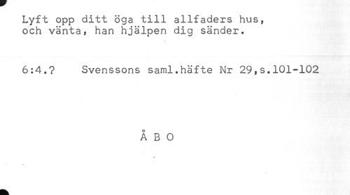 //// Lyft opp ditt öga till allfaders hus, //// och vänta, han hjälpen dig sänder. //// 6:4.? Svenssons saml.häfte Nr 29,s.101-102 //// ÅBO //// w //// # ////