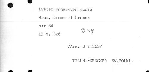 //// Lyster ungersven dansa //// Brum, brummeri brumma //// n:r 34 //// II s. 326 ^ ' //// /Arw. 3 s.263 //// /TILLH.-DENCKER SV.FOLKL. ////