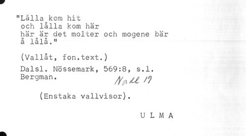 //// "Lalla kom hit //// och lålla kom här //// här är det molter och mogene bär //// å lålå." //// (Vallat, fon.text.) //// Dalsl. Nössemark, 569:8, s.l. //// Bergman. //// (Enstaka vallvisor). //// U L M A ////