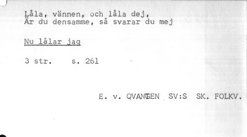 //// ) //// Låla, vännen, och låla dej, //// Är du densamme, så svarar du mej //// t //// Nu lålar jag //// 3 str. s. 261 //// E. v. QVAN(EEN SV:S SK. FOLKV. ////