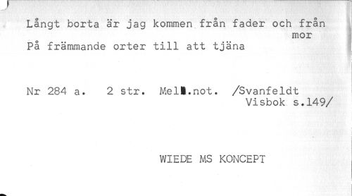 //// Långt borta är jag kommen från fader och från //// mor //// På främmande orter till att tjäna //// < //// Nr 284 a. 2 str. Mel).not. /Svanfeldt //// Visbok s.149 //// /WIEDE MS KONCEPT ////