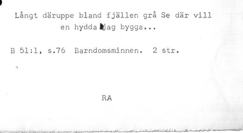 //// Långt däruppe bland fjällen grå Se där vill //// en hydda Éfjag bygga.*. //// B 51:1, s.76 Barndomsminnen. 2 str. //// RA ////