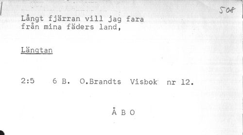 //// Långt fjärran vill jag fara //// från mina fäders land, //// Längtan //// 2:5 6 B. O.Brandts Visbok nr 12. //// ÅBO //// t**- //// h ////