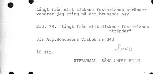 //// Långt från mitt älskade fosterlands stränder //// vandrar jag kring på det brusande hav //// Sid. 78, "Långt från mitt älskade fosterlands //// stränder" //// Jfr Aug.Bondesons Visbok nr 342 //// 18 str. //// STERNWALL SÅNG UNDER SEGEL ////