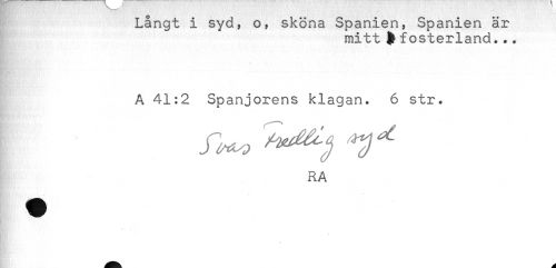 //// Långt i syd, o, sköna Spanien, Spanien är //// mitt & fosterland... //// A 41:2 Spanjorens klagan. 6 str. //// RA ////