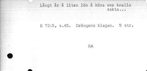 //// Långt ar a liten lön a kora oxe knalla //// M g S 3 R t + + * //// - //// B 72:5, s.45. Drängens klagan. 5 str. //// RA ////