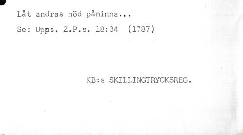 //// Låt andras nöd påminna... //// Se: Upps. Z.P.s, 18:34 (1787) //// KB:s SKILLINGTRYCKSREG. //// s* ////