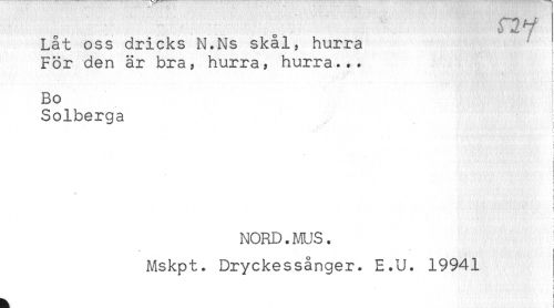 //// Låt oss dricks N.Ns skål, hurra //// För den är bra, hurra, hurra... //// t //// Bo //// Solberga } //// - ' ! //// ! //// ' //// : //// s //// ! //// NORD.MUS. //// Mskpt. Dryckessånger. E.U. 19941 //// ' //// < //// ! //// h ////