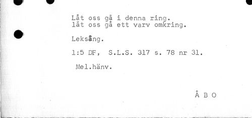 //// Låt oss gå i denna ring. //// låt oss gå ett varv omkring. //// ^ Leksång. //// 1:5 DF, S.L.S. 317 s. 78 nr 31. //// Mel.hänv. //// i //// j ////